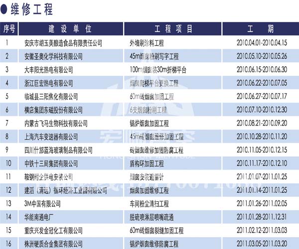 宏順建設(shè)工程有限公司是國(guó)家批準(zhǔn)成立的專業(yè)高空作業(yè)企業(yè):承攬過(國(guó)內(nèi).國(guó)外)煙囪新建、煙囪防腐、磚煙囪新建、煙囪改造、煙囪維修、煙囪脫硫防腐、煙囪拆除加高、煙囪滑膜等高空作業(yè)工程。具有“不搭腳手架 、 不需要停產(chǎn)”施工特點(diǎn)。
